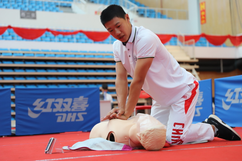 营销(高水平运动队)2018-1班安凌峰在展示心肺复苏操作步骤