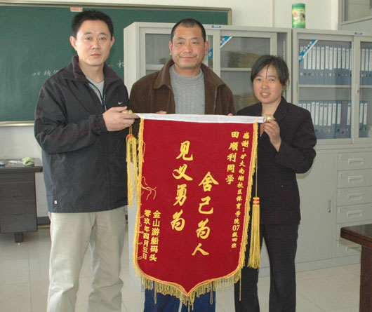 2009年4月9日上午,两位陌生人手捧锦旗来到威廉希尔办公室,寻找体育07-4班员工田顺利同学,并希望向田顺利同学舍己救人的英勇壮举表示由衷的感谢。威廉希尔党委副书记郭鹏接待了他们,并详细了解了有关情况。